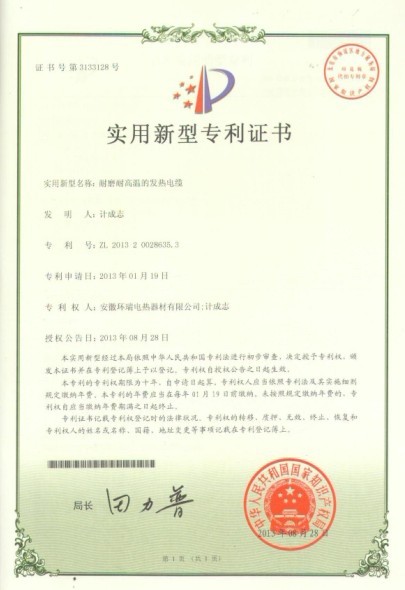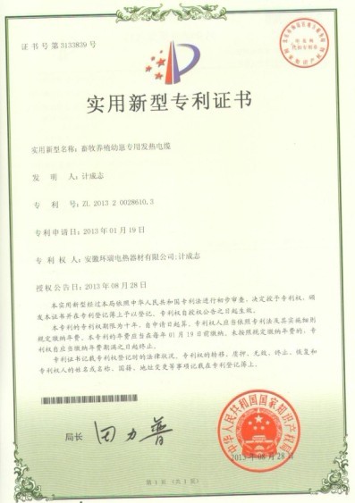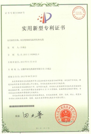 熱烈祝賀環(huán)瑞發(fā)熱電纜獲得三項(xiàng)國(guó)家專利證書