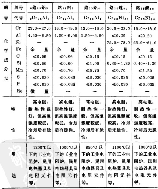 可以用做電熱體的材料是很多的,主要分為金屬電熱體和非金屬電熱體。金屬電熱體又可分為貴金屬及其合金(如鉑、鉑依等),重金屬及其合金(如鎢、鉬等),鎳基合金(如鉻鎳、鉻鎳鐵等)及鐵基合金(如鐵鉻鋁、鐵鋁等)等。在所有的這些金屬電熱體中,應(yīng)用比較廣泛的是鎳基合金和鐵基合金。跳是比較稀少的元素,就鎳所具有的特性用于其他合金更為合適,如高性能的磁性材料,及其他高溫高強(qiáng)度及特殊物理性能的合金等是不可缺少的。我們應(yīng)當(dāng)把電熱合金的生產(chǎn)立足于國(guó)內(nèi),因此在電熱合金中節(jié)省鎳和不用鎳是非常重要的。
