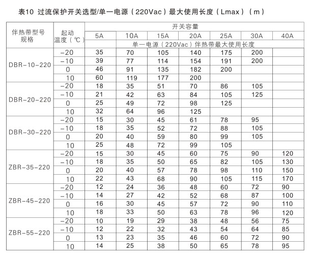 第三步: 根據(jù)表5,發(fā)現(xiàn)Lmax=67m,需5A開關(guān),Lmax=136m需10A開關(guān)?,F(xiàn)熱線長度為L=120m,選10A開關(guān)足夠。
