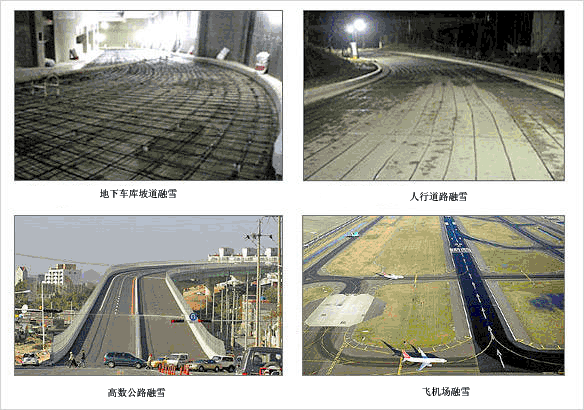 潔凈的人行路面,使人們活動無冰雪困擾;避免傳統(tǒng)道路除冰雪方式帶來的昂貴費用及除雪劑給路面帶來的損害 ;有效的融化坡道、階梯、直升機起降站和其它路面上的冰雪,清除危險,減少不便;